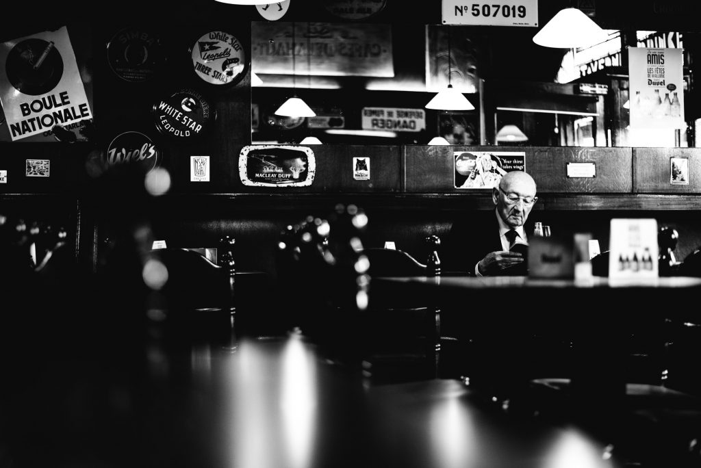 J’adore arpenter Namur mon boitier à la main et à l’œil. Il faut dire que j’y ai mes habitudes (dont je me dois souvent de sortir) et surtout mes lieux de prédilection. Ce bar en est un, surtout pour son cappuccino crème chantilly (que la balance désapprouve complètement). De ma table j’ai vu entrer ce monsieur. Il était bien habillé, serein, il s’est assis et a commencé à lire son journal. J’ai trouvé qu’il se fondait parfaitement dans son environnement. J’ai utilisé mon liveview pour ne pas attirer son attention, boitier posé sur la table. J’ai cadré, fait ma mise au point et j’ai déclenché. Cette photographie est à mes yeux un haïku, un moment suspendu de plénitude, de calme, de contemplation. Elle caractérise parfaitement ce lieu : les tables en bois disparates, les murs remplis de plaques métalliques, etc.